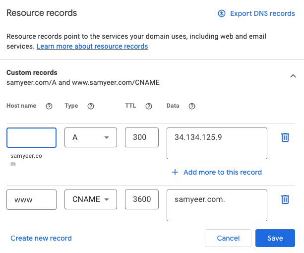 Now go to your domain server and setup an “A” record. Put the static ip address you got in the A record. Here is what my records look like in google domains.