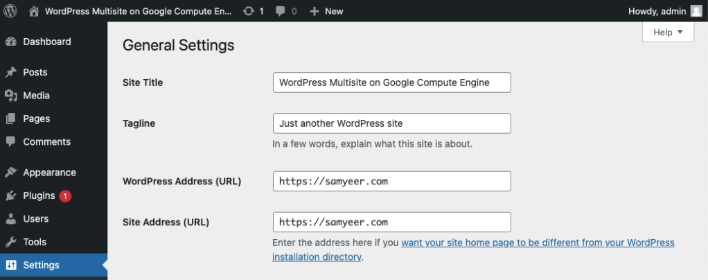go to Settings | General Settings and set the domain name for your site there. Remember to set it up with the HTTPS address. Yes my screenshot is wrong. Its too much work to fix it. 🙂