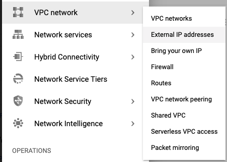 Your VM will get a dynamic IP address. It’s a good idea to convert that to a static ip. From the Menu select VPC Network | External IP Address.