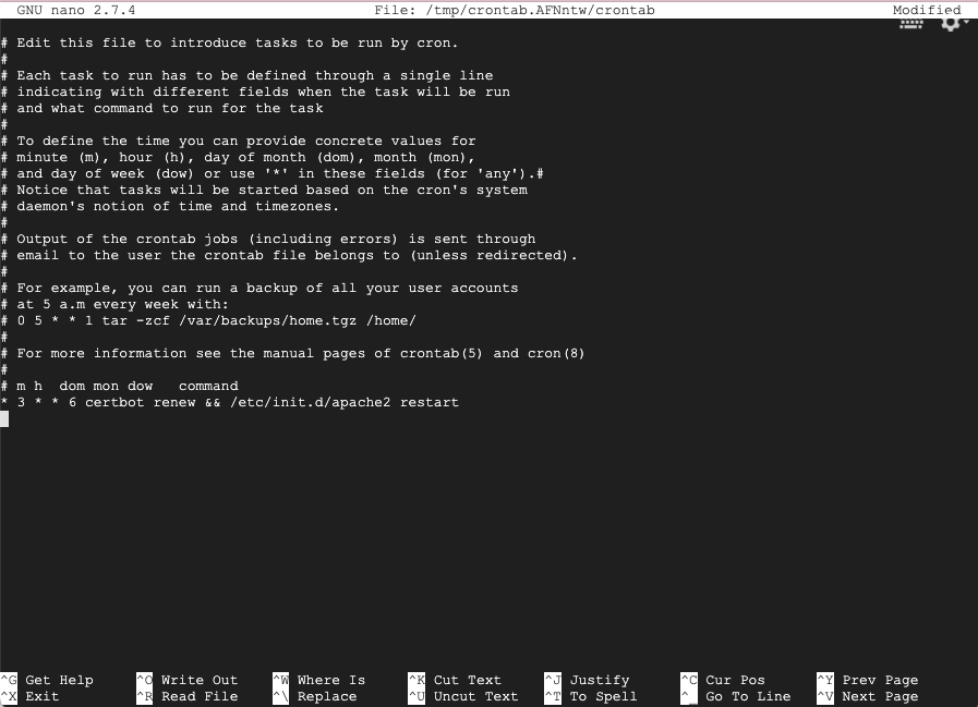 * 3 * * 6 certbot renew && /etc/init.d/apache2 restart