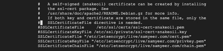 SSLCertificateFile "/etc/letsencrypt/live/your-domain-name/cert.pem" SSLCertificateKeyFile "/etc/letsencrypt/live/your-domain-name/privkey.pem" SSLCertificateChainFile "/etc/letsencrypt/live/your-domain-name/chain.pem"